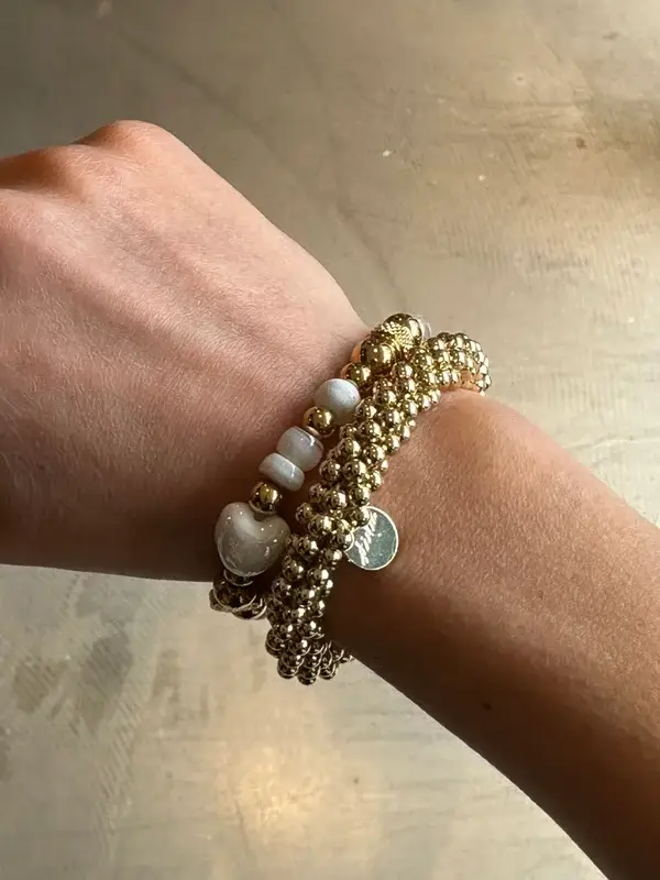 Haarelastiek en armband in kleur Goud met stalen kralen.