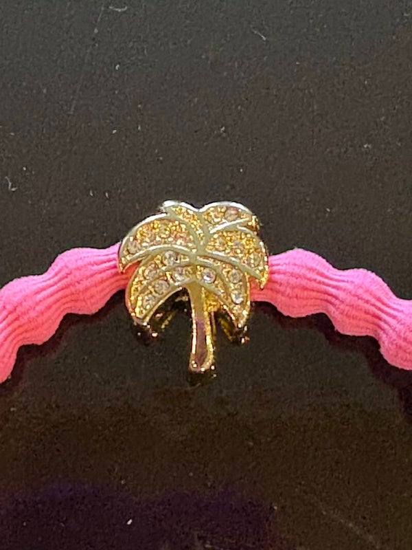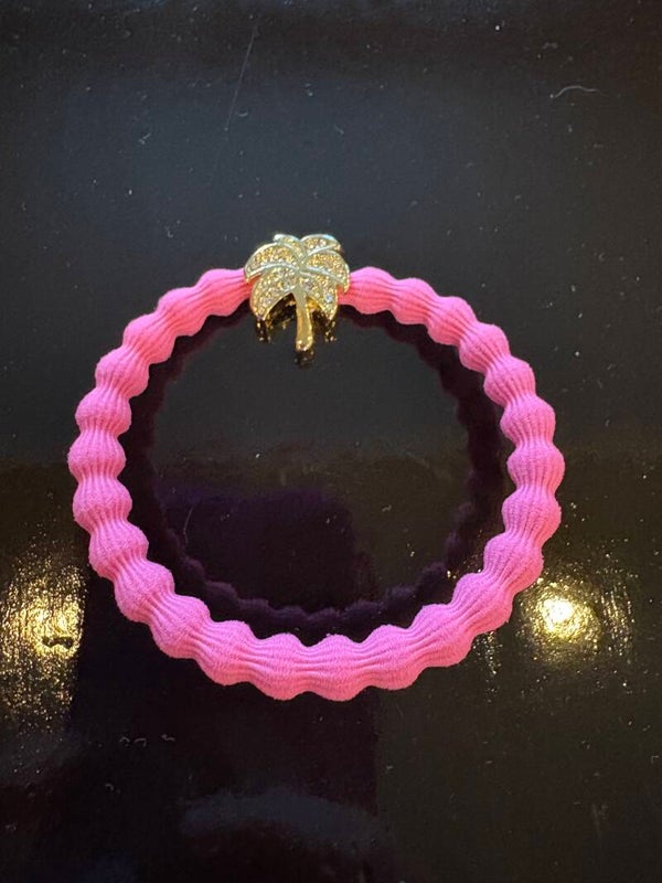 Leuk roze haar elastiek met palm boom met steentjes . Ook leuk als armbandje te dragen