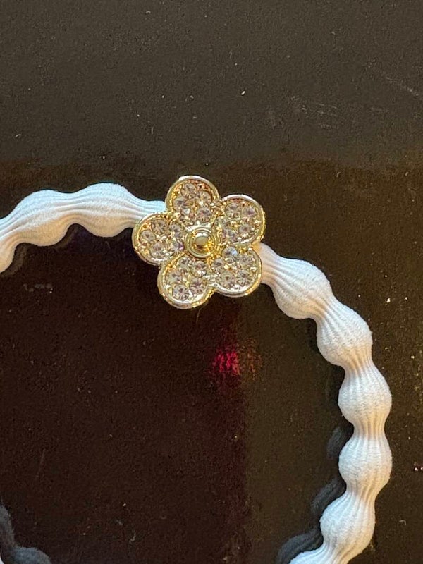 Wit haarelastiek / armbandje met een bloemetje met steentjes