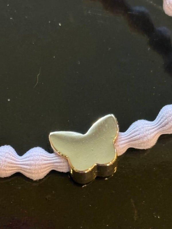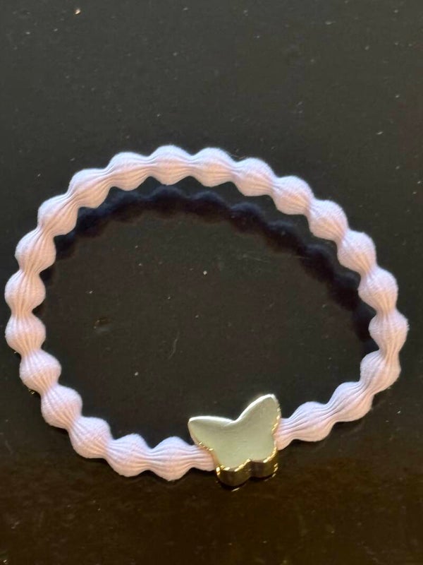 Lila / licht paars haar elastiek / armbandje met een gouden gladde vlinder