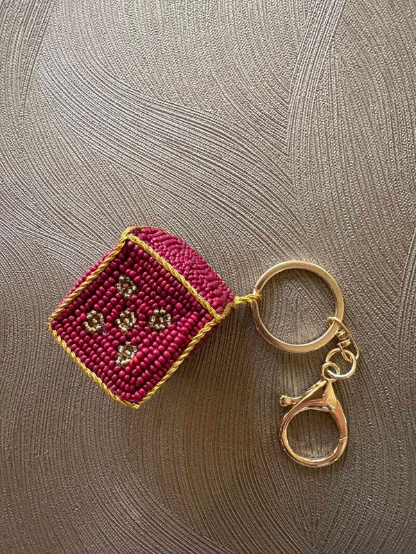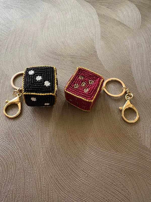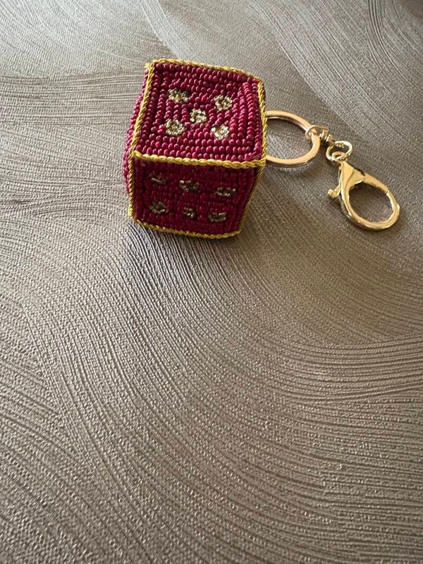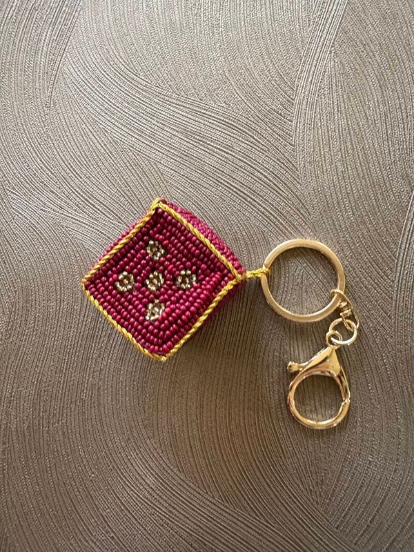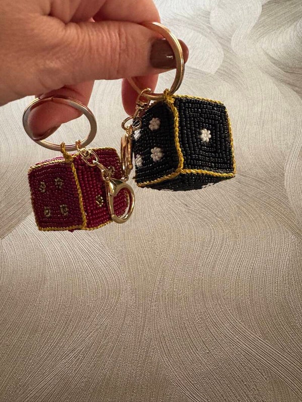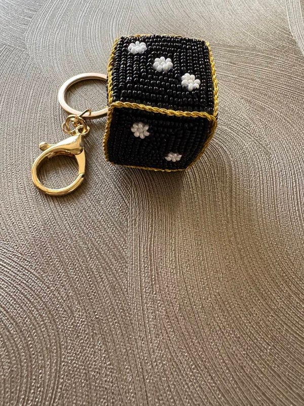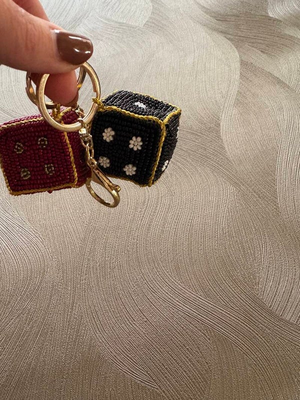Hoe leuk zijn deze bagcharm in de vorm van een dobbelsteen met de hand gemaakt