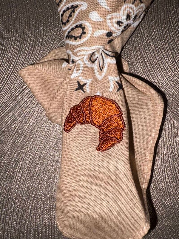 In een mooie beige kleur en een mooi croisantje er op geborduurd